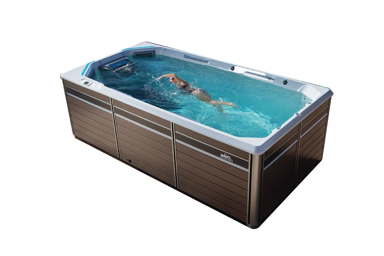 The Endless Pools E-550 exemplifies a disciplined, user-centered design approach. In contrast to conventional swim spa layouts, the E-550 employs a simplified and highly efficient configuration that increases the effective size of the swim basin by relocating the entry points to the front corners and fully integrating the seating into the overall architecture. This strategic reconfiguration eliminates unnecessary rear geometry, increasing interior volume and reducing disruptive backflow within the swim zone.